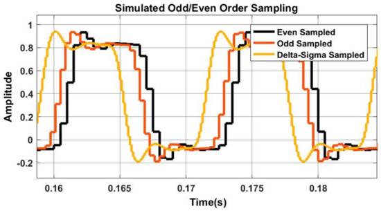 This portrays the phase performance between 1st order delta-sigma and odd/even order sampling. The phase difference between 1st order delta-sigma and odd/even sampling was created for the design by the transport delay between the signals, and should be ignored for analysis. 1st delta-sigma is indicated by the yellow, odd order sampling by red and even order sampling by black. It should be noted there is a (n−1) phase lag between even order sampling (black) and odd order sampling (red).