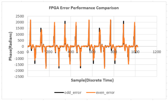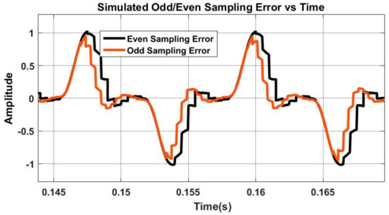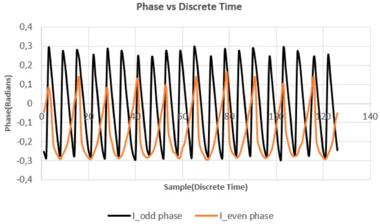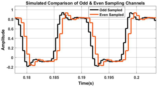 This portrays the phase lag performance between odd and even order sampling. Odd order sampling was marked by black and even order sampling was by red. It should be noted that the (n−1) phase lag between even order sampling (red) and odd order sampling (black) varies per period interval.