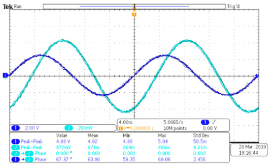 The oscilloscope output performance of I/Q demodulator with I component connected to Channel 1 and Q connected to Channel 2.