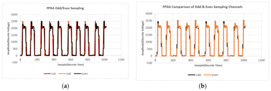 FPGA architecture implementation results: (a) Source signal which is in phase with I and odd/even order sampling results; (b) Odd and even order sampling results with Vivado integrated logic analyzer (ILA) window configured to 1 kilobyte.