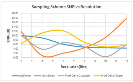 This figure presents SNR performance between the new odd/even order, Mod-∆, Mod-∆ (Gaussian) and Mod-∆ (Noise) sampling.
