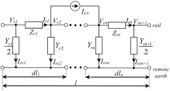 According to earth-return circuit theory, a rail route can be modeled by an equivalent rail–single conductor with ground return lying on the ground surface [3]. Details of distributed parameters of this circuit can be found in [3,4,28,32,33]. The equivalent rail is energized by currents supplied by a substation and a vehicle (load), respectively.