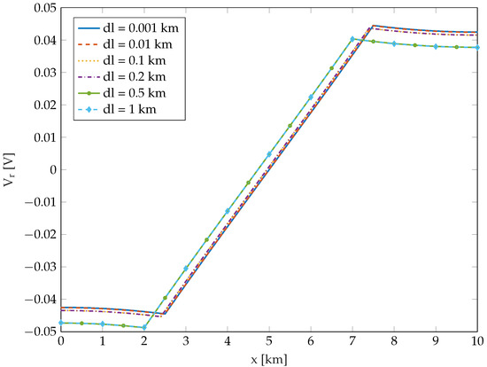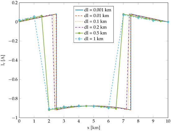 The entire length of the rail can be divided into elementary sections with different electrical parameters or different lengths. Nodes and branches were defined in the model. Their number can be arbitrary; if the number of nodes is too small, the calculation error is too large to successfully apply this method. Exemplary simulations for a straight section of rail with electrical parameters = 0.02 /km, = 0.76 S/km and length l = 10 km energized by the vehicle ( = 7.5 km) and substation ( = 2.5 km) with current I = 1 A are shown in Figure 3 and Figure 4. On the basis of the presented simulation results, it can be stated that the length of a single segment should not be greater than 2% of the total length of the simulated earth-return circuit. For more geometrically complicated systems, the number of nodes can be optimized using appropriate methods (e.g., genetic algorithm). Nodal analysis is a method that can be used to calculate rail current and potential. Current in the rail is calculated using equation