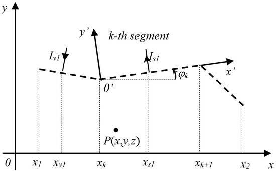 For example, the potential in the ground at a given point of observation produced by the current flowing in the kth segment is determined on the basis of the relation in Equation (6) assuming that the segment with length is supplied with a substation current . After transforming the coordinates of the observation point (transposition and rotation), calculations are carried out in the local coordinate system according to Equation (7):
