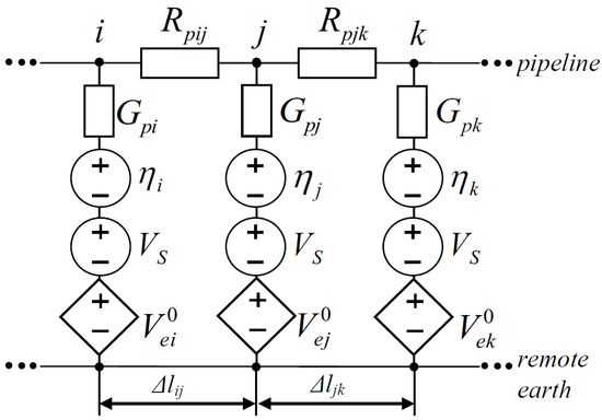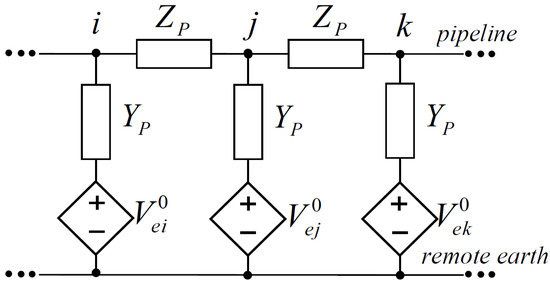 To analyze the current that flows into a pipeline, the described method in Section 2.2 can be used [13]. The pipeline, similar to the rail in the previous section, can be modeled as a circuit with lumped parameters. The scalar potential of the electric field can be modeled using controlled-voltage sources () (controlled by leakage currents from rails according to Equations (5) and (6), with no leakage currents and no earth scalar potential ) acting in shunt branches of the –two ports, as shown in Figure 6 [24].