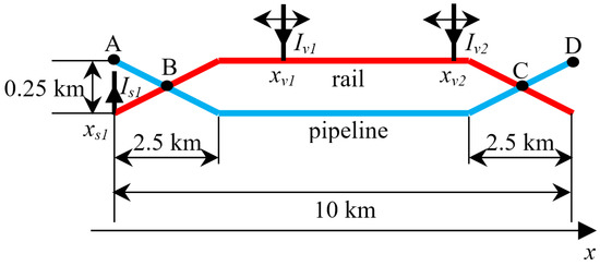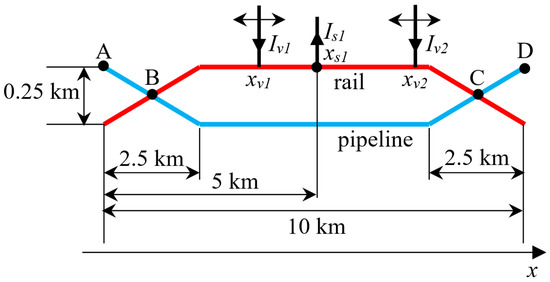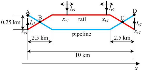 Layout of pipeline-railway track collocation (top view, no scale; Example 1).