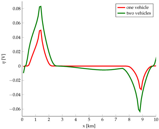 To check the effect of the substation position, Example 2 is presented. In contrast to Example 1, the substation was located at Point = 5 km (Figure 14). Calculations were carried out only for the case with two vehicles.