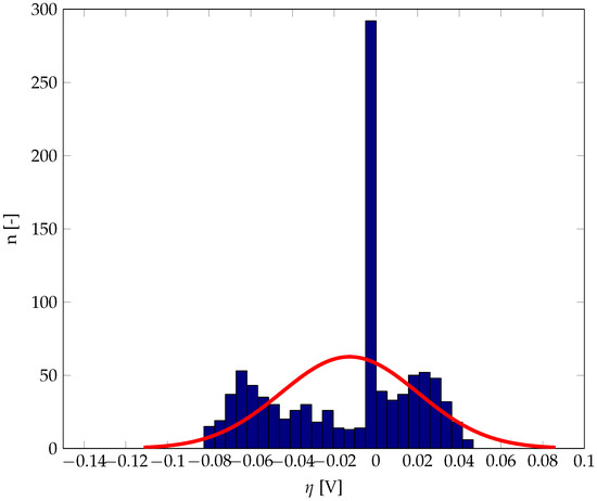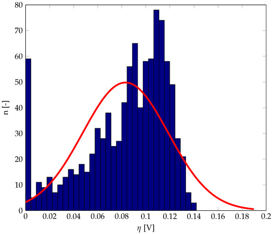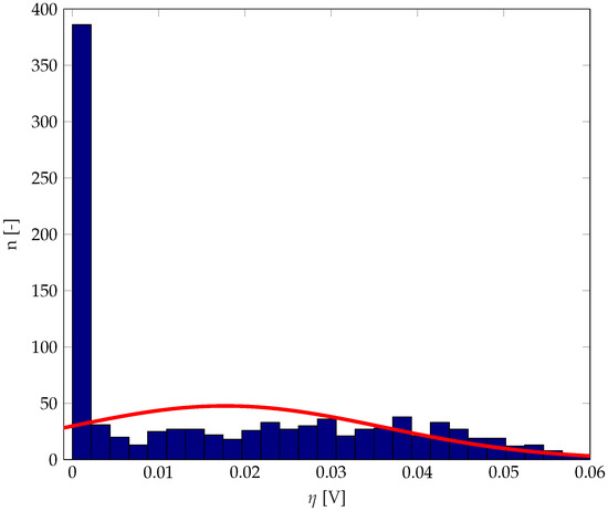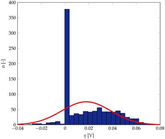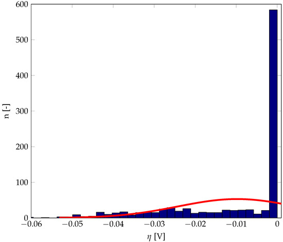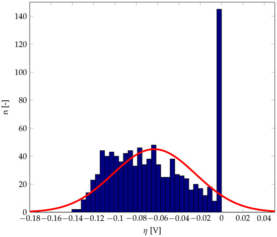 Overpotential values at selected points of the structure (Points A–D) are presented in Figure 16, Figure 17, Figure 18 and Figure 19. Based on this observation of overpotential histograms, it can be concluded that Points B and D are also at risk of electrochemical corrosion, because about 40% of the obtained overpotential values are positive. Therefore, observing only the average overpotential value is insufficient.