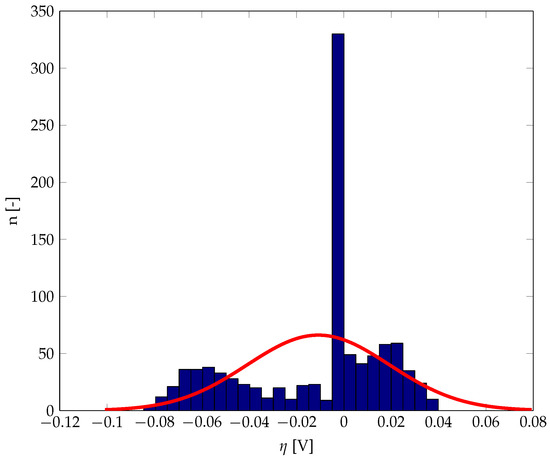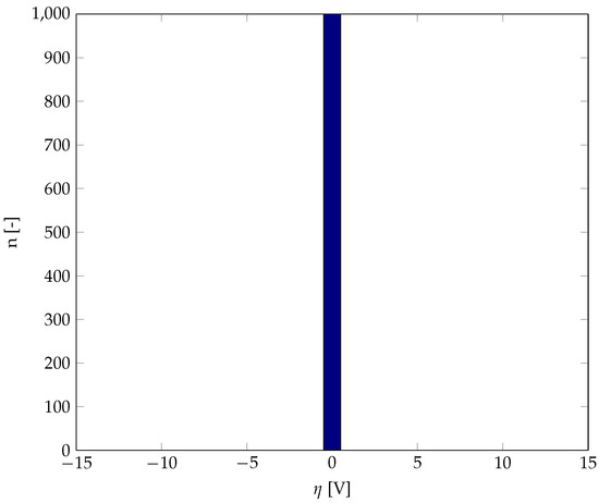 To show the possibilities of the proposed method, two examples are presented. Overpotential along a pipeline located near the D.C. traction had its quantity calculated (Figure 8). Rail parameters were equal: = 0.02 /km and = 0.76 S/km. In the first case, the rail was energized by a substation at Point = 0 km. Two variants were considered for this type of traction network supply. In the first option, the rail was energized by one vehicle at random position . The second example considered two vehicles at random positions and . In each case, the currents of vehicles was random in range = 100–1000 A, for each of them. Soil conductivity was equal to = 0.01 S/km. A pipeline with diameter 355.6 mm and electrical parameters = 0.02 /km, = 11 S/km was buried at a depth of 1.0 m. To calculate polarization effect, = ±0.1 V, and = 0.004 A/m were assumed. Overpotential distribution along the tested pipeline was determined on the basis of 1000 tests. Simulation results are shown in Figure 9, Figure 10, Figure 11, Figure 12 and Figure 13.