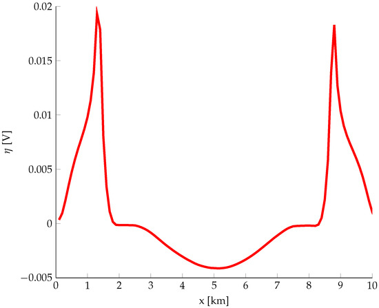 Observation points were situated in the same places as in Example 1. Load currents of individual stations depended on the position of the vehicles. Figure 21 shows the average value of overpotential distribution along the pipeline.