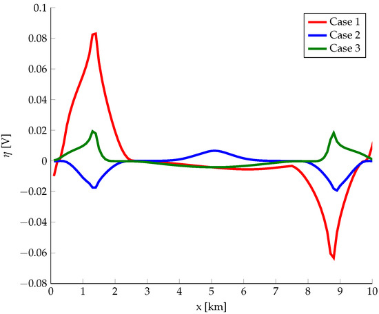 To estimate the pipeline-corrosion risk, overpotential was observed along the structure. This parameter allowed defining anode and cathode zones. In the example, the average overpotential value had positive values in a range from x = 0.3 km to x = 2.5 km. This was the anodic zone (corrosion hazard). In a range from x = 7.5 km to x = 9.6 km, the overpotential had negative values (cathodic zone). The stray current in this region flowed into the pipeline. In the range of x from x = 9.6 km to x = 10 km, the average value of the overpotential distribution along the pipeline was positive, thus the anodic zone also occurred there. It can be observed that the number of vehicles do not change the shape of overpotential average value, but it gives only an amplifying effect. Comparison of average overpotential value distribution along the pipeline for different numbers of vehicles is shown in Figure 9.