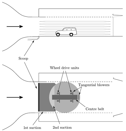 - Sternéus, J.; Walker, T.; Bender, T. Upgrade of the Volvo Cars Aerodynamic Wind Tunnel; SAE Technical Paper 2007-01-1043; SAE International: Warrendale, PA, USA, 2007. [Google Scholar] [CrossRef]