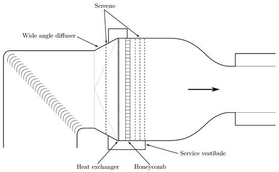 - Meredith, S.; Martindale, W.; Benetti-Longhini, L.; Boylan, D.; Chaney, M. Aerodynamic commissioning results for the Korea Air Force Academy Subsonic Wind Tunnel. In Proceedings of the 38th Aerospace Sciences Meeting and Exhibit, Reno, NV, USA, 10–13 January 2000; American Institute of Aeronautics and Astronautics: Reston, VA, USA, 2000. [Google Scholar] [CrossRef]
