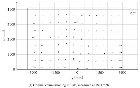 Flow angularity at the turntable center plane as measured during the two commissioning campaigns. Data from the respective commissioning reports [21,22]. Arrows in upper right corner show the magnitude of flow angularity in pitch and yaw.