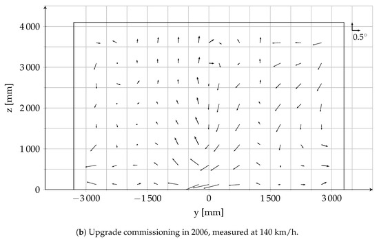 The flow angularity for standard operating conditions is shown in Figure 10a. Since the airpath has not been altered in any major way after the moving ground upgrade, Figure 4b and Figure 10a should be very similar. However, a significant difference can be seen in the upper half of the right side of the test section, where the inward and downward flow seen in 2006 is not visible in the present data. A similar flow pattern is visible in all of the measurement planes for the 2006 data [22]; for the most upstream planes the whole right hand side has a strong in- and downwash. The clear difference between the two lateral halves for the most upstream plane does not appear to be physical, and it is believed that this was caused by issues with the references used for the optical measurements of the probe mounting angles. These measurements were performed using a total station, which was likely mounted on different sides of the test section depending on the lateral position of the vertical strut. Hence, it is plausible that different reference points were used for the two lateral halves, thus causing the observed offset of the angles if one set of reference points were misplaced.