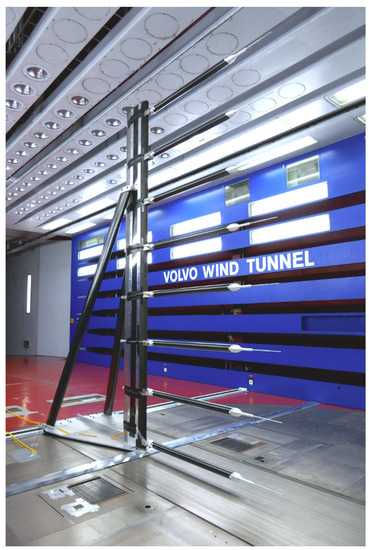 - Nilsson, L.U.; Berndtsson, A. The New Volvo Multipurpose Automotive Wind Tunnel; SAE Technical Paper 870249; SAE International: Warrendale, PA, USA, 1987. [Google Scholar] [CrossRef]
