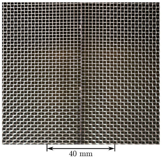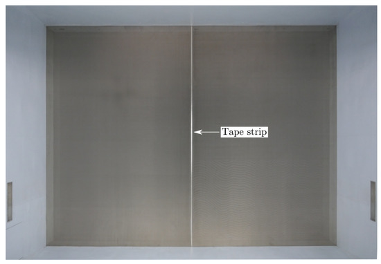 As described, each turbulence screen consisted of two sheets welded together vertically at the centerline. This was done thread-by-thread as shown in Figure 7 in order to minimize the blockage. Despite this precaution, it has been hypothesized that these welds might have had an impact on the test section flow, especially since they lined up for the three screens. This was tested by exaggerating the width of the weld by adding a strip of 40 -wide tape to the upstream side of the downstream screen, as shown in Figure 8, and then measuring the flow angularity.