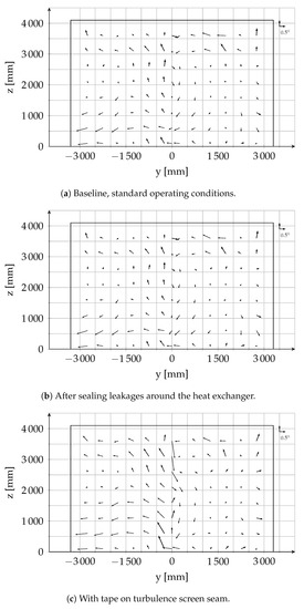 The influence on flow angularity from the performed modifications to the flow conditioning devices in the settling chamber can be seen in Figure 10. Comparing Figure 10a and Figure 10b, it can be seen that sealing the heat exchanger leakage does not impact the flow angularity in the test section. It is likely that the disturbance from the leakage flow is small enough to be dampened out by the three turbulence screens mounted downstream of the heat exchanger, and thus not result in any measurable impact on the test section flow field.