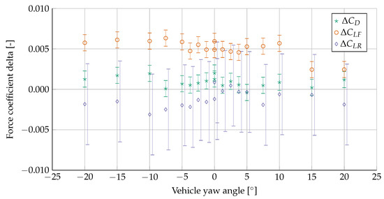 From the figure, it can be seen that is within the in-test repeatability for most yaw angles, with a notable exception being the largest negative angles. However, the maximum delta is still within the between test repeatability. Considering the rear axle lift, the measured difference is within the in-test repeatability for all yaw angles. This is not the case for the front axle lift, which was consistently increased by over the full yaw angle range, with the exception of the two largest positive angles. This increase is expected, given that the tape induces an upwards flow in the lower central region of Figure 10c. However, both and are within the between test repeatability of the wind tunnel throughout the full yaw angle range, and thus not considered substantial. Furthermore, the difference in flow angularity introduced by the tape was of a similar magnitude as the flow angularity under standard operating conditions. Thus, it is likely that the present flow angularity did not have a significant influence on the forces measured on a vehicle, compared to an ideal flow without angularity.