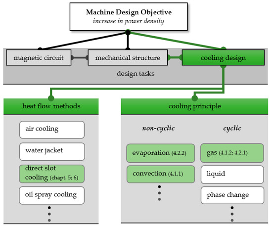 The scope of this paper is illustrated in Figure 1 as the green path. In this case, the focus is on studying the theoretical potentials of cooling technologies for conventional high-power density machines with one phase fluid cooling applicable to drives of some MW rating for smaller aircrafts or single aisle aircraft. With a new proposal for direct slot cooling, a high potential to improve the cooling system is identified and so this is studied in depth in Section 5. The results will help develop a design strategy for aviation drives.