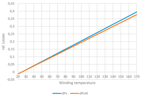 Assuming an average winding temperature of 155 °C [11] and a coolant temperature of 60 °C, a typical temperature drops of 95 °C for conventional machines, e.g., with water jacket cooling is obtained. Reducing the coolant temperature to lower values while keeping the temperature drop constant influences the resistance and the winding losses. Figure 2 depicts the losses related to a winding temperature of 25 °C for a copper winding (dPv) and an aluminium winding (dPvAl).