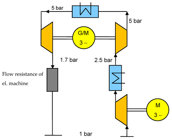 The conducted studies showed that a two-stage compression with the intercooler could be a viable approach. The power output of the turbine could cover a part of the necessary compressor power, so turbine and one compressor are on the same shaft with an electrical motor-generator unit between them (compander). The sketch of an h-s-chart of the process is given in Figure 4.