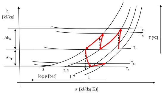 In the first step, a simple cooling machine was studied, which is similar to the ones used in refrigerators or industrial cooling processes. The structure is given in the scheme of Figure 5. For a better understanding, the process is depicted in the p-h diagram of Figure 6 [19].