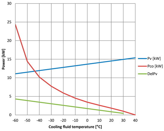 Transferred power Pv and compressor power Pco over the cooling fluid temperature.