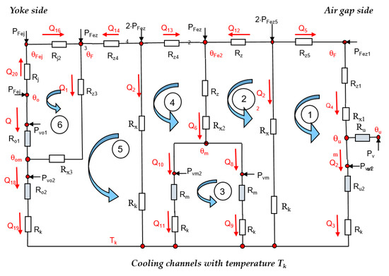 The thermal transfer network of Figure 14, therefore, represents the implemented calculation model for the analytical calculation. For a more efficient mathematical handling, the network was redrawn. It is assumed that all heat flows are conducted to the cooling channels on the temperature level Tk. The heat flows in the branches of the network are denoted as Q and the distributed losses are named Pv. The resistance of the channel walls is named Rk. The iron losses are denoted as PFez for the tooth and PFej for the yoke sections, respectively.