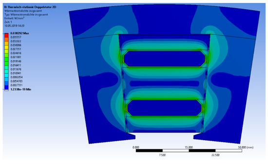 Table 5 displays the calculated values of the temperature drops at the hot spots of the slot resulting from numerical and analytical calculation. Figure 16 shows the density of the heat flow within a single slot pitch. The main heat flow that goes directly to the cooling channels were assumed to be at a constant temperature of 80 °C. Clearly, there is also a heat flow around the cooling channel edges over the tooth iron, which were not represented in the analytical calculation. Figure 17 shows the temperature values within a slot pitch (current density of 15 A/mm2, steady state, copper filling factor of 70%).