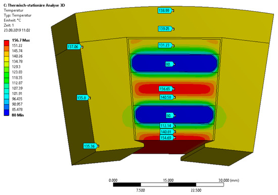 Numerical calculation of temperature distribution based on a cooling fluid temperature of 80 °C. Maximum temperature rise in the winding is 76 K.