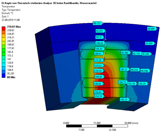 The obtained accuracy of the analytical calculation is satisfying the usual uncertainty of the material database. A comparatively high temperature drop in the walls of the cooling channels of 17 K can be observed. In this case, we can identify an optimization potential by choice of material and wall thickness.