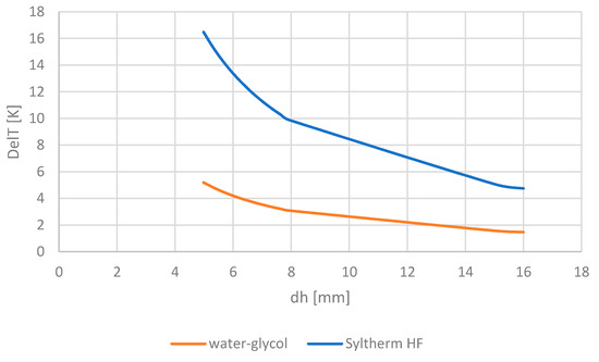 Furthermore, we can conclude that an increase of the hydraulic diameter or increase of velocity (higher pressure) will have a positive influence on the temperature drop and the heat transfer.