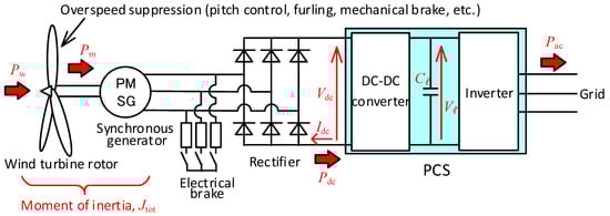 When a voltage dip occurs at the alternating current (AC) output terminals, the maximum active power that the generation system can output is reduced in proportion to the terminal voltage reduction. In the case of the PV power system, treatment of excess energy is not a concern because the input power can be decreased simultaneously (up to zero, if necessary) with an increase in the PV array voltage (up to a maximum of the open-circuit voltage) by the control of a power electronic interface, such as a direct current (DC)–DC converter []. However, in the case of the wind power system, the input power extracted from the wind turbine blades cannot be rapidly reduced, given that any factor, such as the pitch angle, needs to be mechanically controlled []. This results in an imbalance between the input and output power of the wind turbine, which leads to an increase in the rotational speed. If SWTs use doubly fed induction generators (DFIGs), advanced control strategies could become available to restrict over-voltage without such extra hardware as dump resistors [,]. However, DFIGs are rarely used on SWTS, and many SWTs use permanent magnet synchronous generators (PMSGs) [], in which overspeed directly leads to excessive terminal voltage.