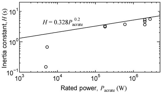 As listed in Table 1, the following parameters are related to the inertia constant of horizontal axis wind turbines (HAWTs): the rated output power , inertia of a wind turbine rotor , inertia of a generator rotor , gear ratio , number of generator pole pairs , and frequency of generator voltage with rated power output under normal conditions. The equivalent inertia of the wind turbine and the generator rotor referred to the turbine shaft is . The rated angular velocity of the wind turbine rotor is then . Based on these equations, the inertia constant was calculated, as shown in Figure 3 and Table 1. Moreover, the following approximate relationship obtained from Equation (10) in [] is also shown in Figure 3.