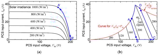 Figure 5a presents typical - curves of a PV array connected to a PCS in a PV system, with several cases of respective solar irradiance values, numerically simulated by using the equations and parameters in []. The PCS input voltage is adjusted to maximize , which is referred to the MPPT control, under normal operating conditions. In the case of the solar irradiance of 1000 W, as shown in Figure 5a, the point A’ at V is the maximum power point (MPP) on the curve. Upon the occurrence of a voltage dip with a residual magnitude of zero, as discussed in Section 3.3, the PCS output power is reduced to zero; thus, the PCS input power is also reduced to zero by reducing the PCS input current to zero. Consequently, the PCS input voltage increases to an open-circuit voltage of 200 V, which implies that the operational point shifts from A’ to B’ along the curve. There are no significant changes during the voltage dip, which has a duration of s. After the recovery of the AC voltage , the PCS output power is rapidly recovered by decreasing to the MPP voltage with the control of the power electronic interface in the PCS, which indicates that the operational point re-shifts from B’ to A’. Such an operation is attained generally by PCSs for residential PV systems in Japan.
