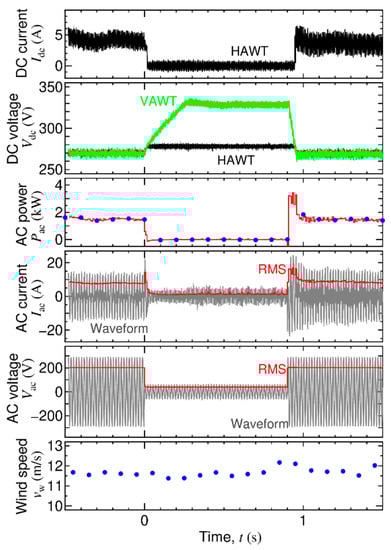 The performance of the system during the test can be described as follows. The PCS output power was 1.5 kW prior to the voltage dip, which indicates that the mechanical input power was approximately 1.5 kW, according to Equation (2). However, reduced to zero at time due to the voltage dip, and the turbine angular velocity of the HAWT and VAWT increased, in accordance with Equation (2), where had no drastic variation (strictly, was estimated to be gradually reduced due to the deviation of from , given that no significant variations in the wind speed were observed). However, the increases in the turbine angular velocity and the DC voltage were restricted by the use of the electrical brakes: from s in the HAWT, and from s in the VAWT. Because the variation in was small in the HAWT, regardless of the voltage dip, power consumption in the electrical brake during the voltage dip was estimated to be almost the same as before the voltage dip. Thus, the current in the electrical brake during the voltage dip was estimated to be almost the same as before the voltage dip in the HAWT, although it was not measured owing to the limited number of channels in the oscilloscope. After the recovery of AC terminal voltage of the PCS at s, the PCS re-generated active power . From this time until s, was higher than that its value immediately prior to the voltage dip, due to the - characteristic of the MPPT, as shown in Figure 2. Finally, the DC voltage decreased to its initial value prior to the voltage dip. The duration of the excess power output was significantly shorter than that in the case of the 5-kW SWT system, as described in Section 3.3, which is due to the energy dissipation in the electrical brakes during the voltage dip.