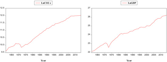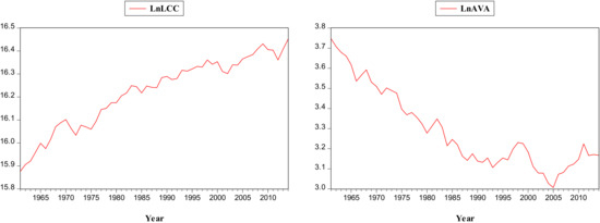 where lnCO2 et lnGDPt, lnLCCt and lnAVAt expressed the natural logarithm of carbon dioxide emissions, gross domestic product, crop production index, land under cereal crop and agriculture value-added, respectively. In the above equation (4), t =1,…….N represents the time period and is the error term. The parameters measure the long-run elasticity of carbon dioxide emissions with respect to the real GDP, land under cereal crop and agriculture value-added respectively.