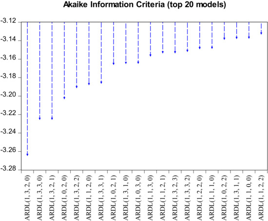 Furthermore, the study estimates the AIC to prefer the optimal model by employing long-run and short-run association among variables. Employing the Akaike information criterion shows the top 20 possible ARDL models in Figure 2. Based on the model specification in equation (4), the short-run and long-run equilibrium relation LnCO2 e, LnGDP, LnLCC and LnAVA is estimated using the ARDL regression analysis shown in equation (5) where