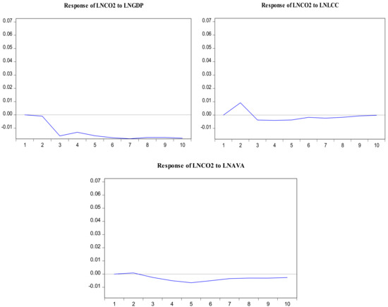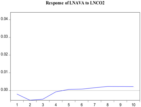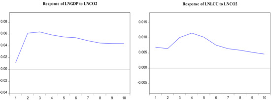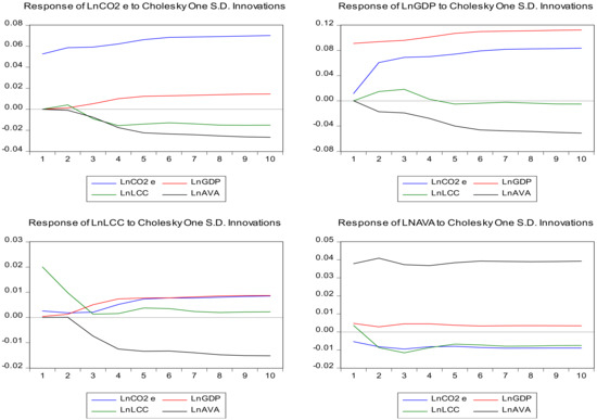 Table 10 estimates Cholesky’s method of variance decomposition to random innovation affecting the variables in the VAR [68]. The results indicate that almost 4.3% of the future fluctuations in LnCO2 e is due to shocks in the LnGDP, 0.27% of future fluctuations in the LnCO2 e is due to shocks in LnLCC and 0.27% of future fluctuations in the LnCO2 e is due to shocks in LnAVA, respectively. Evidence from the table shows that almost 25% of future fluctuations in LnGDP is due to shocks in LnCO2 e, 10% of future fluctuations in LnGDP is due to shocks in LnAVA and 2.9% of future fluctuations in LnGDP is due to shocks in LnLCC. Moreover, evidence from the results shows that almost 37% of future fluctuations in LnLCC is due to shocks in LnCO2 e, 24% of future fluctuations in LnLCC is due to shocks in LnAVA and 10% of future fluctuations in LnLCC is due to shocks in LnGDP. Finally, the evidence from Table 9 shows that almost 6.2% of the future fluctuations in LnAVA is due to shocks in LnLCC, 1.9% of future fluctuations in LnAVA is due to shocks in LnGDP and 0.4% of future fluctuations in LnAVA is due to shocks in LnCO2 e, respectively.