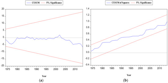 Stability test based on (a) cumulative sum of the recursive residuals (CUSUM) and (b) CUSUM of squares. Source. Authors’ calculation.