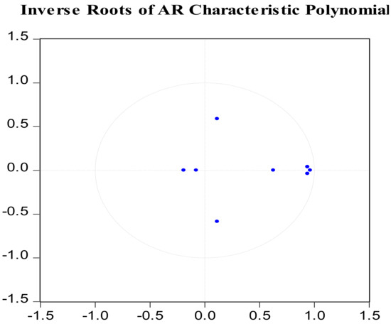 Furthermore, the inverse root of AR polynomial graph displaying the stability of the model where are blue dots is within the circle. Figure 5 shows the inverse root of AR polynomial estimation.