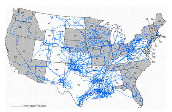 - U.S. Energy Information Administration. About U.S. Natural Gas Pipelines – Transporting Natural Gas. Available online: https://www.eia.gov/naturalgas/archive/analysis_publications/ngpipeline/interstate.html (accessed on 17 October 2019).