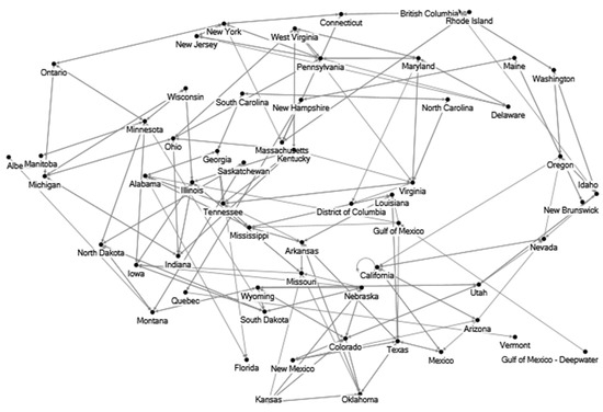 Annual data relative to the flow of natural gas from state to state along the US interstate gas pipelines were retrieved from the EIA database for the period 2013–2017 [65]. These data were used to assemble the adjacency matrix relative to the gas network for every year. The following SNA centrality metrics were calculated for every matrix: In-degree, out-degree, emission degree, reception degree, flow betweenness, and sociometric status. Because of the high correlation between the emission degree and the sociometric status, the latter was omitted from the analysis. The basic network statistics are provided in Table 2. Figure 2 shows the representation of the interstate US natural gas infrastructure as a graph. Table 3 displays the mean and maximum values relative to SNA indexes from 2013 to 2017. As the data show, both the mean and maximum values increased from 2013 to 2017 for all indexes.