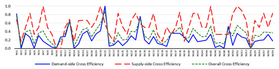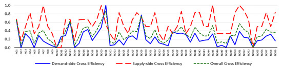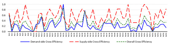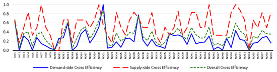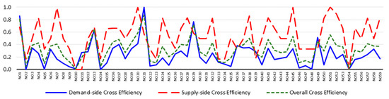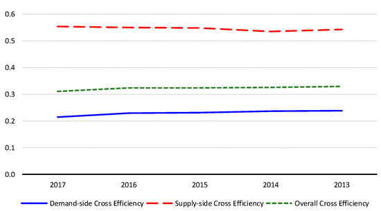 Figure 3 illustrates changes in the cross-efficiency mean values relative to the whole network from 2013 to 2017. Cross-efficiencies were computed from both perspectives of the supply side and demand side. The overall cross-efficiency measurement was obtained as the weighted average of the two previous cross-efficiencies utilizing the set of weights generated through the Shannon’s entropy index procedure. For the sake of brevity, the list of weights was not included in the paper.