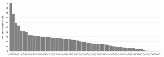 Figure 9, Figure 10 and Figure 11 display the ranking of network nodes using a histogram graph. On the vertical axis of the graph, cross-efficiency scores are reported. The bars are placed on the graph in rank order. Thus, bars at the left side have the highest cross-efficiency score. The graphical analysis was restricted to year 2017 only. The results clearly show that the influence of a node is not equal from the two different perspectives that were adopted to assess the network. Indeed, the ranking of network nodes in Figure 9 significantly differs from the ranking in Figure 10. That supports the idea that it is necessary to collect information and assess the gas network from different perspectives to gain an in-depth understanding of its capacity and performance, and finally identify critical nodes. Additionally, the different rankings provided by the two assessment perspectives suggest that the supply-side perspective appears more critical than the demand-side one.