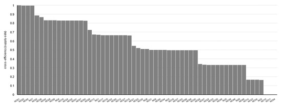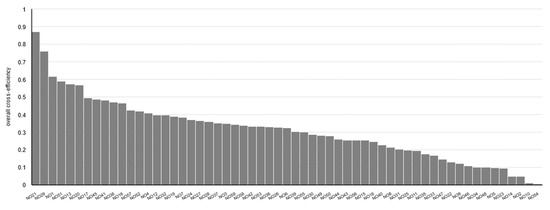 In both DEA models, constant returns to scale and output orientation were used to solve Equation (2). The two indexes were aggregated to have an overall cross-efficiency measurement using the Shannon’s entropy index to generate weights applying the procedure suggested in the literature [66,67,68].