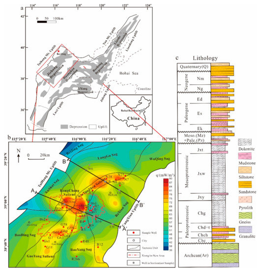 (a) The Geological setting of Jizhong Depression in the Bohai Bay basin, China; (b) Observed heat flow distribution and location of research wells; (c) Stratigraphic histogram of the Xiong’an area.