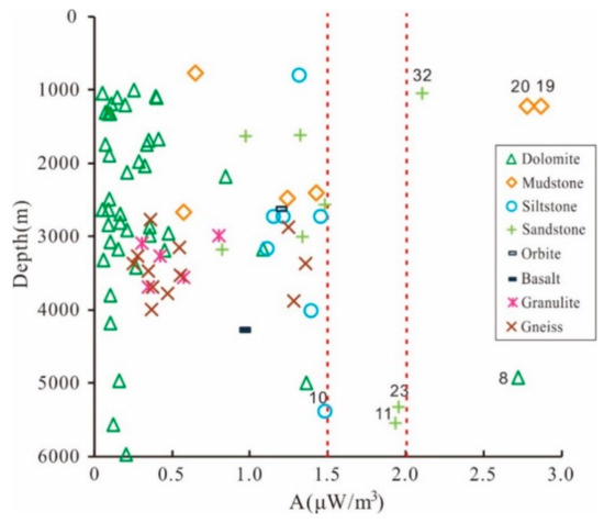 Relation between heat production and sample depth. The dolomite, mudstone, and sandstone sample numbers deviated from normal values.