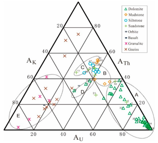 - Shen, P.; Zhu, H.Y.; Xu, Y.C. Distribution characteristics of uranium, thorium and potassium in sedimentary rocks. Acta Sedimentol. Sin. 1983, 3, 109–122. [Google Scholar]
